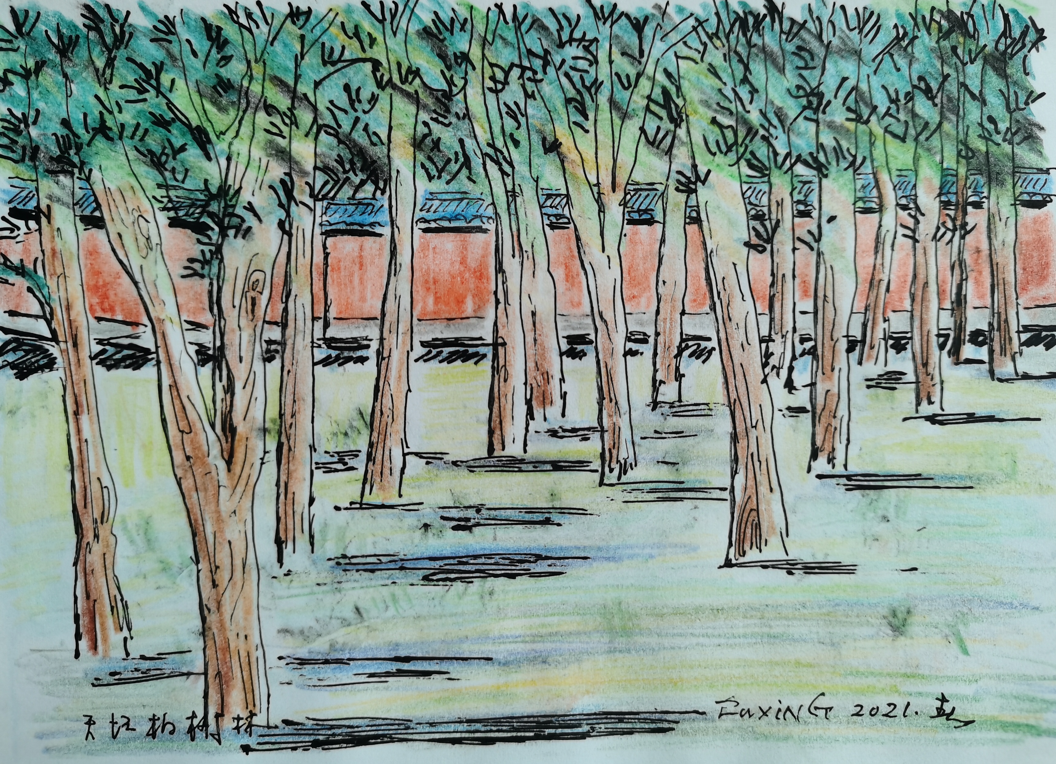 五一那天上午,我坐在北天门内垣墙根儿前的长椅上画画,这里阳光充足,前面是宽敞的甬道,旁边是柏树林,散发着春天清新的气息。我身边的另一个椅子上,坐着一个年轻的小伙子,我来之前,他就坐在这里,不知已经坐了多久。说实在的,我就是一眼看见了他,才坐在他旁边的椅子上,想画他的。他身穿整齐笔挺的藏蓝色西装,还打着条猩红色的领带,很是醒目,引起我的兴趣。这样的节日里,逛天坛的人都是来休闲的,很少见这样正装的样子。他似乎没有注意到我在画他,一直显得百无聊赖,手里摆弄着手机,目光游离,时不时在往东边看。东边不远,是北天门的三座大门,那里,游人出出进进,多如过江之鲫。我猜测,他可能是在等人。