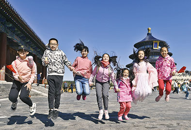 一群小朋友在北京天坛公园内拍照留念。新华社资料片(鲁鹏摄)