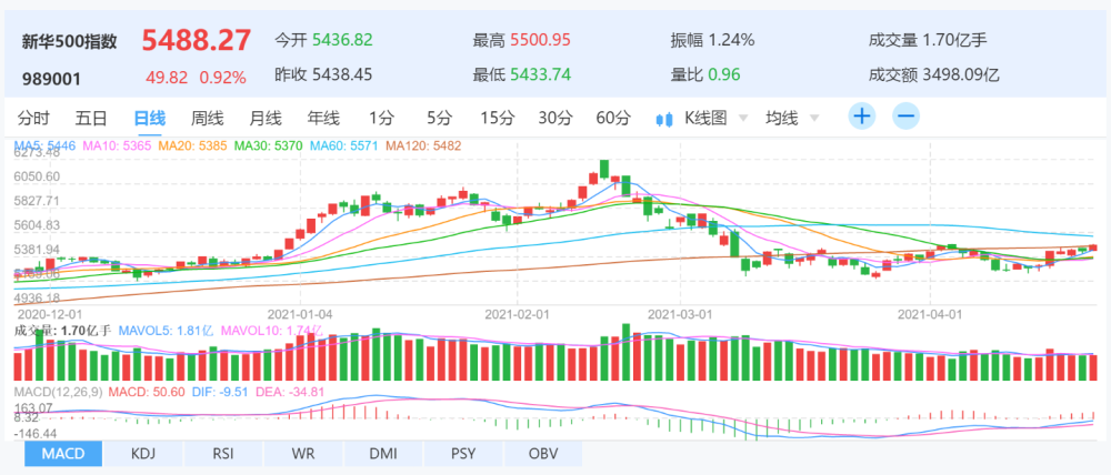 新华社北京4月23日电(记者闫鹏)本周新华500指数(989001)平开高走。截至23日收盘,新华500指数报5488.27点,累计上涨3.53%,成分股合计成交1.75万亿元。