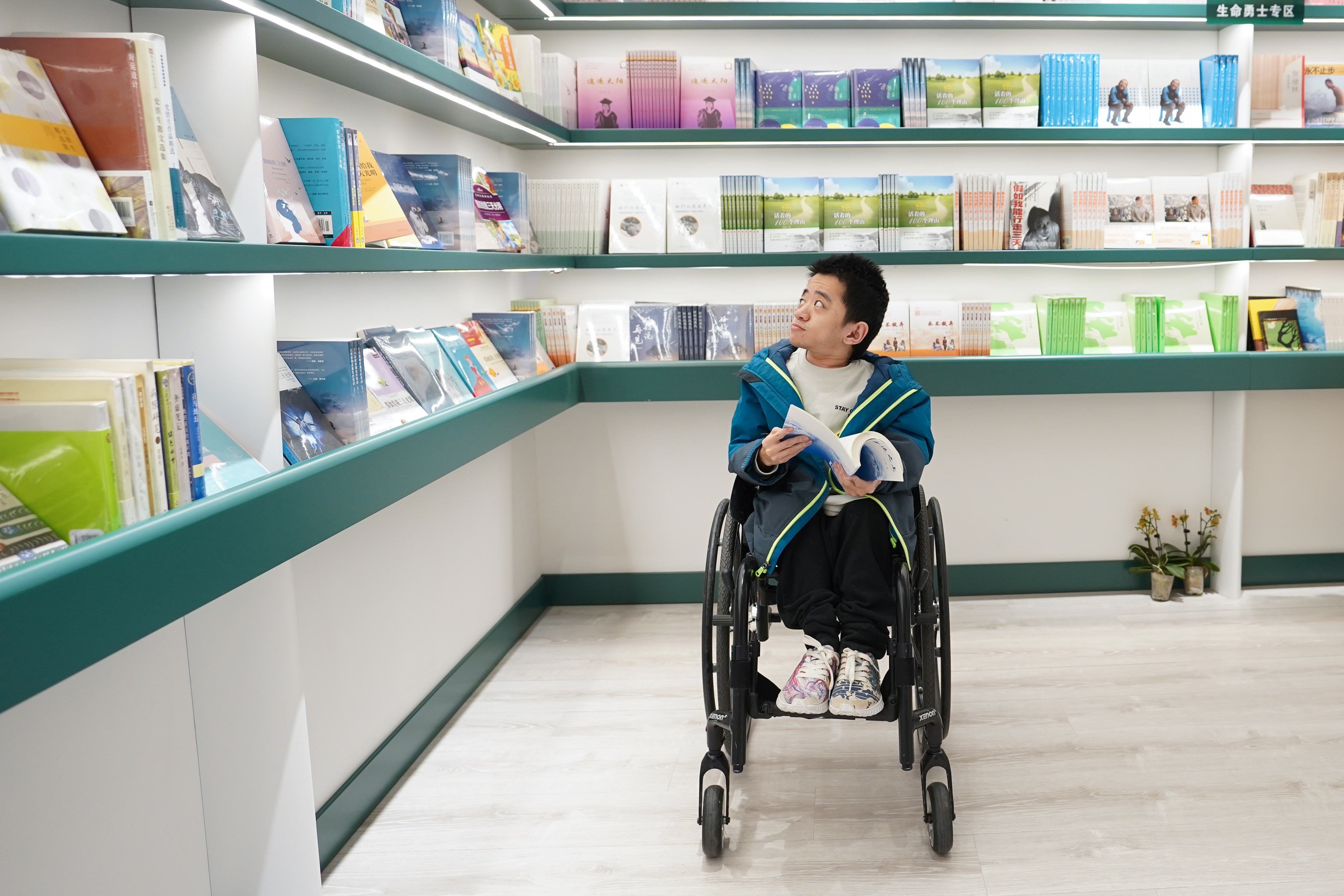 27岁的刘大铭罹患罕见的成骨不全症。他常去善缘书舍,一坐就是一天。这里吸引他的不仅是丰富的书籍,还有便捷的无障碍设施。新华社记者 鞠焕宗 摄