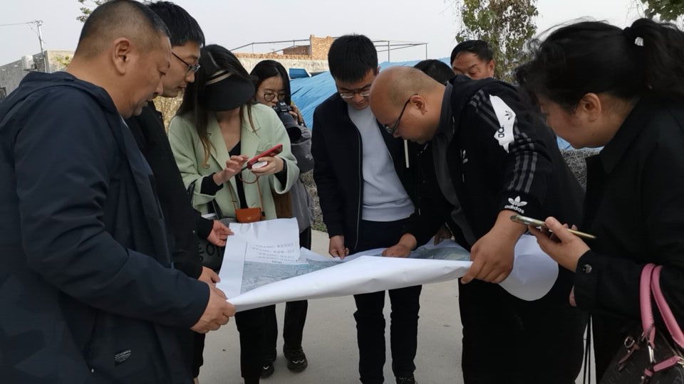 新华社记者与当地干部一起查看吕村土地规划图。(摄影:林红梅)