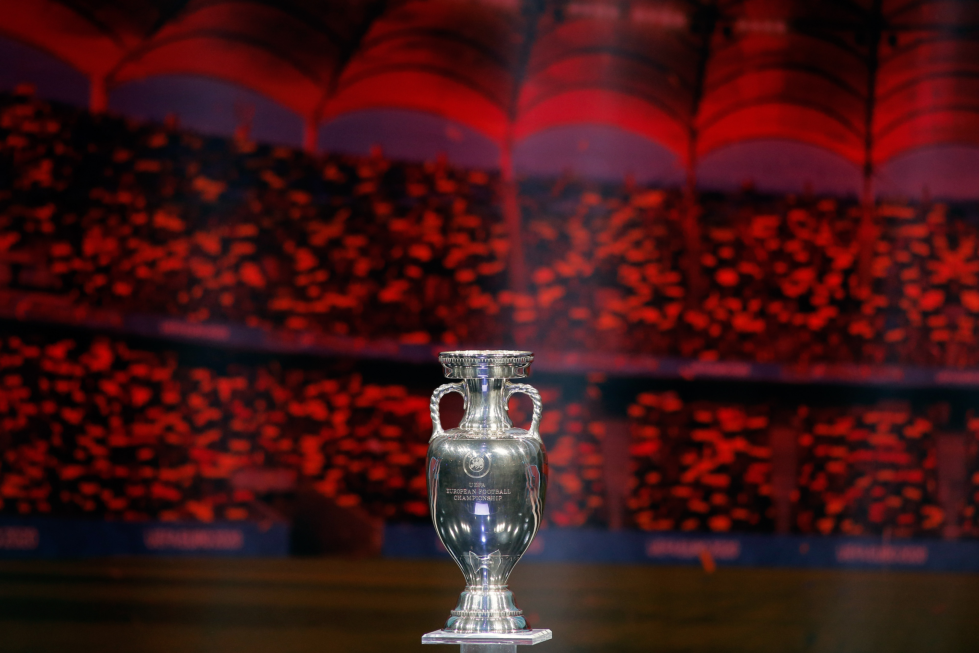 2019年11月30日,在罗马尼亚布加勒斯特2020年欧洲足球锦标赛分组抽签仪式上拍摄的欧锦赛冠军奖杯。新华社发(克里斯蒂安·克里斯泰尔摄)