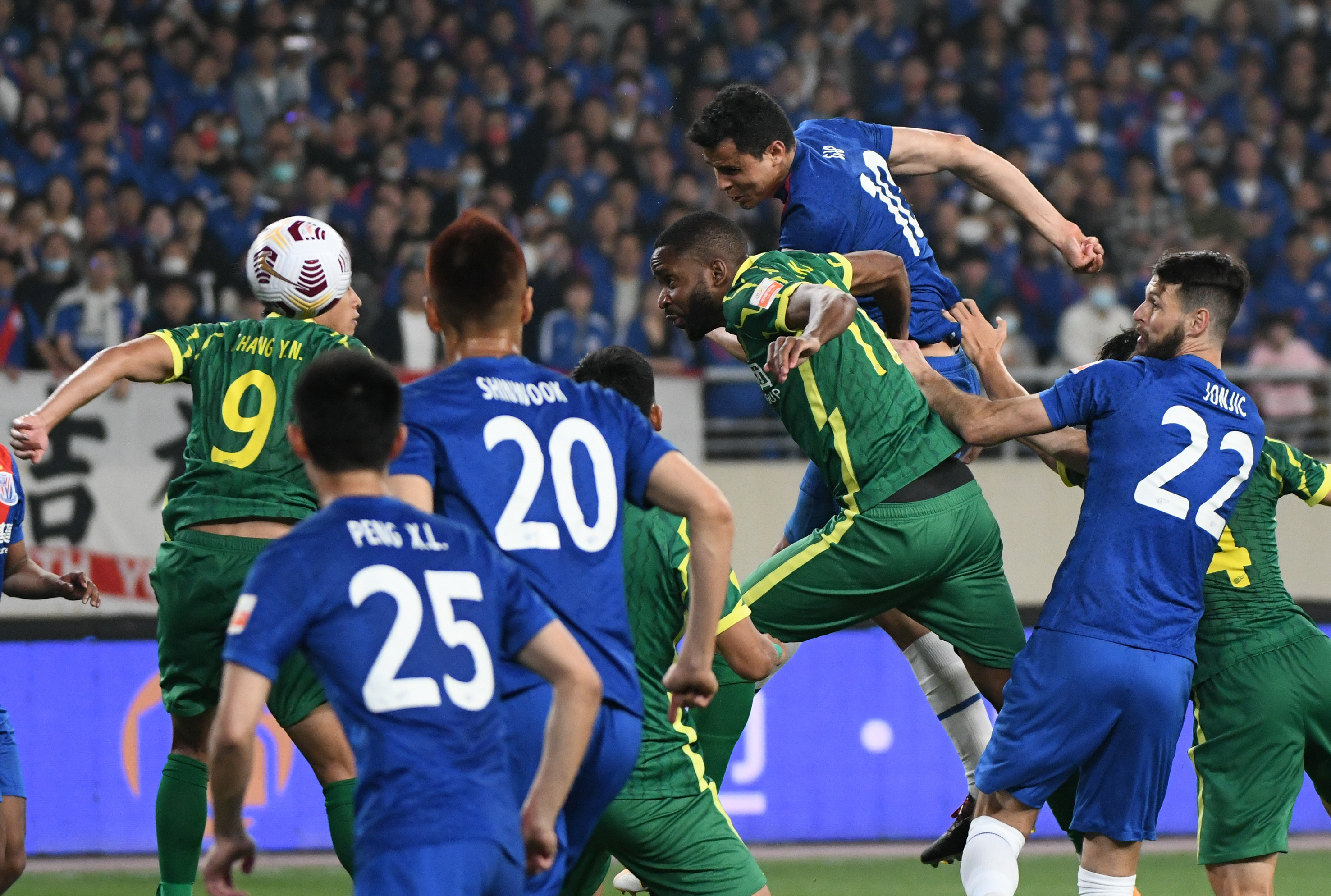 上海申花队球员莫雷诺(上)在比赛中头球破门。新华社发(史康摄)