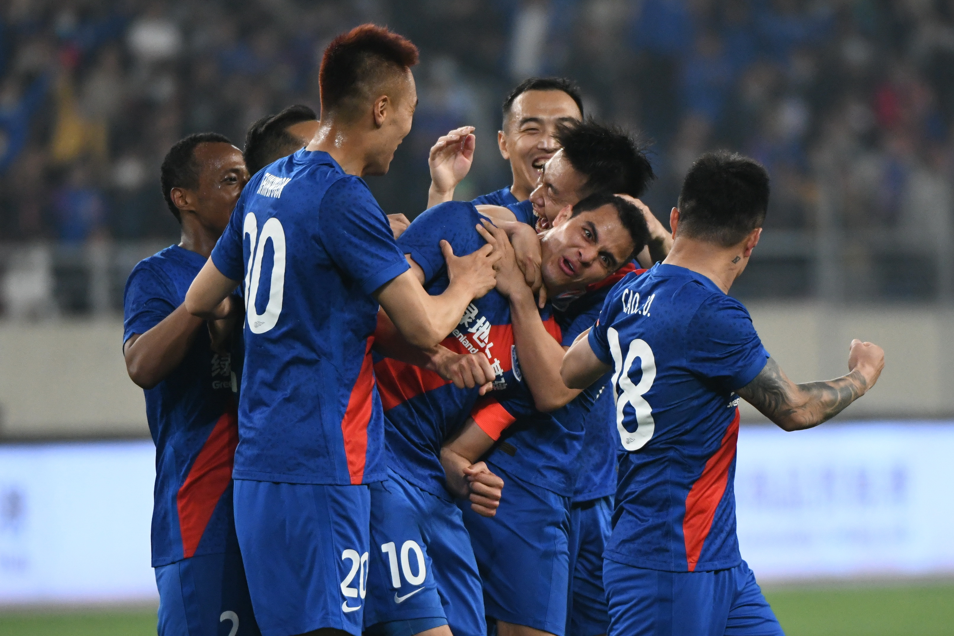 上海申花队球员莫雷诺(右二)与队友在比赛中庆祝进球。新华社发(史康摄)