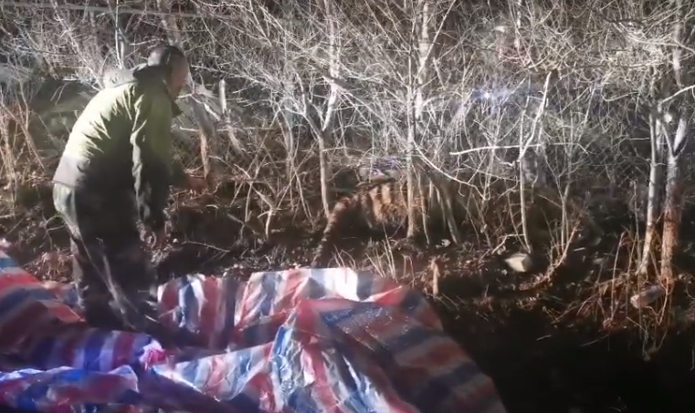 据介绍,今晚6时左右林业部门专业人员抵达现场开始使用麻醉枪处置,起初打了两枪麻醉针,老虎在躲了近六个小时后从草垛子下面跑了出来,还咬爆了一只车胎。随后又实施了一枪麻醉针,老虎跑跑停停躲进田地里,再次出现在路边时又中一枪。四枪麻醉后,在8时40分左右才倒下,9时左右彻底睡着安全收网。