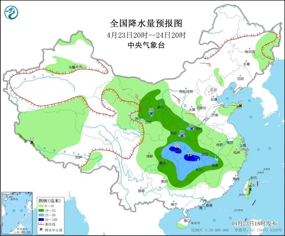 4月23日20时至24日20时,新疆北疆阿勒泰及沿天山地区、甘肃祁连山山区、青海东部和北部、西藏西部等地有小到中雪或雨夹雪,其中,西藏西部等地的部分地区有大雪,局地暴雪;西北地区东部、四川盆地东部、黄淮西部、江汉、江南中西部、贵州东部、广西北部、台湾岛东部等地的部分地区有中到大雨,其中,重庆北部、湖北西南部、湖南北部局地有暴雨。