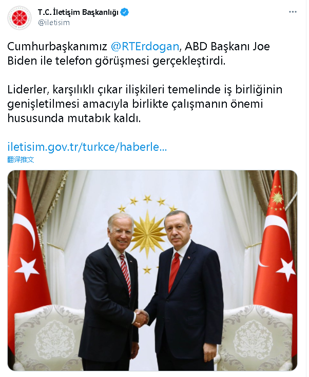 当地时间4月23日,土耳其总统府新闻局发布声明称,土耳其总统埃尔多安与美国总统拜登通电话。这是拜登自今年1月20日就任美国总统以来首次与埃尔多安通电话。