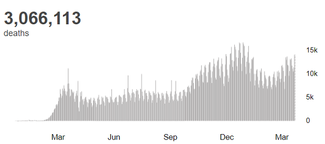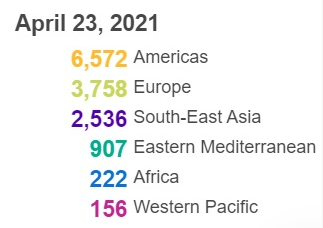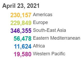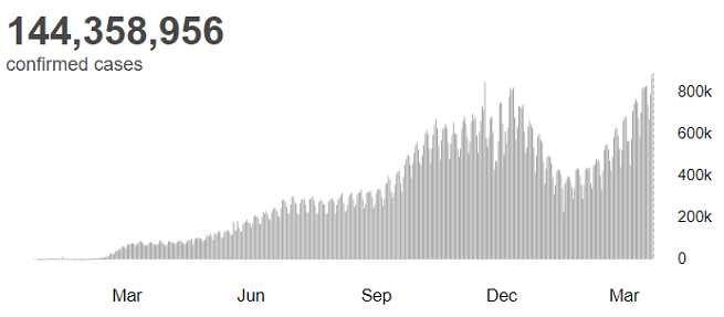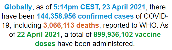 根据世卫组织最新实时统计数据,截至欧洲中部夏令时间4月23日17时14分(北京时间4月23日23时14分),全球累计新冠肺炎确诊病例144358956例,累计死亡病例3066113例。23日全球新冠肺炎确诊病例新增894043例,单日新增病例数量再次达到疫情暴发以来最高,死亡病例新增14151例。