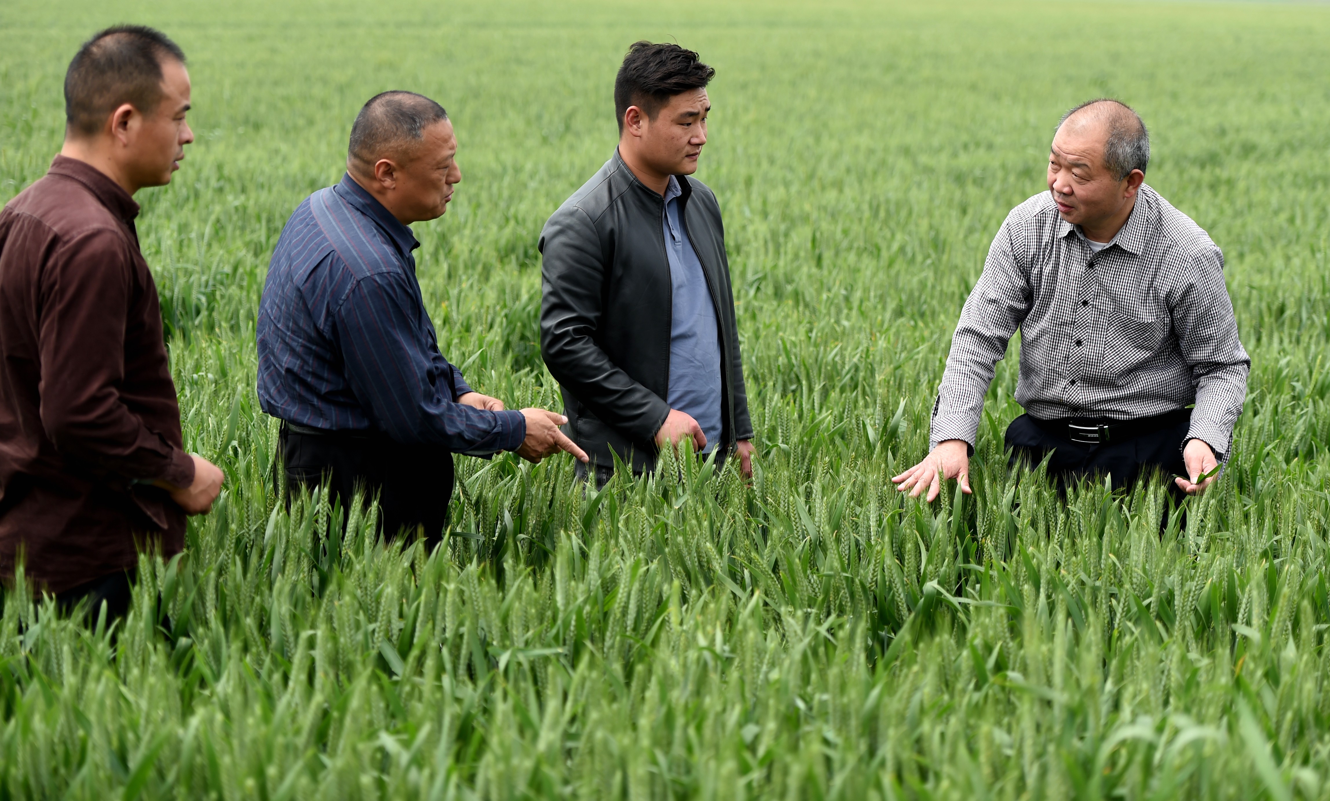姜明阳正在春耕春管、观察高筋小麦的长势