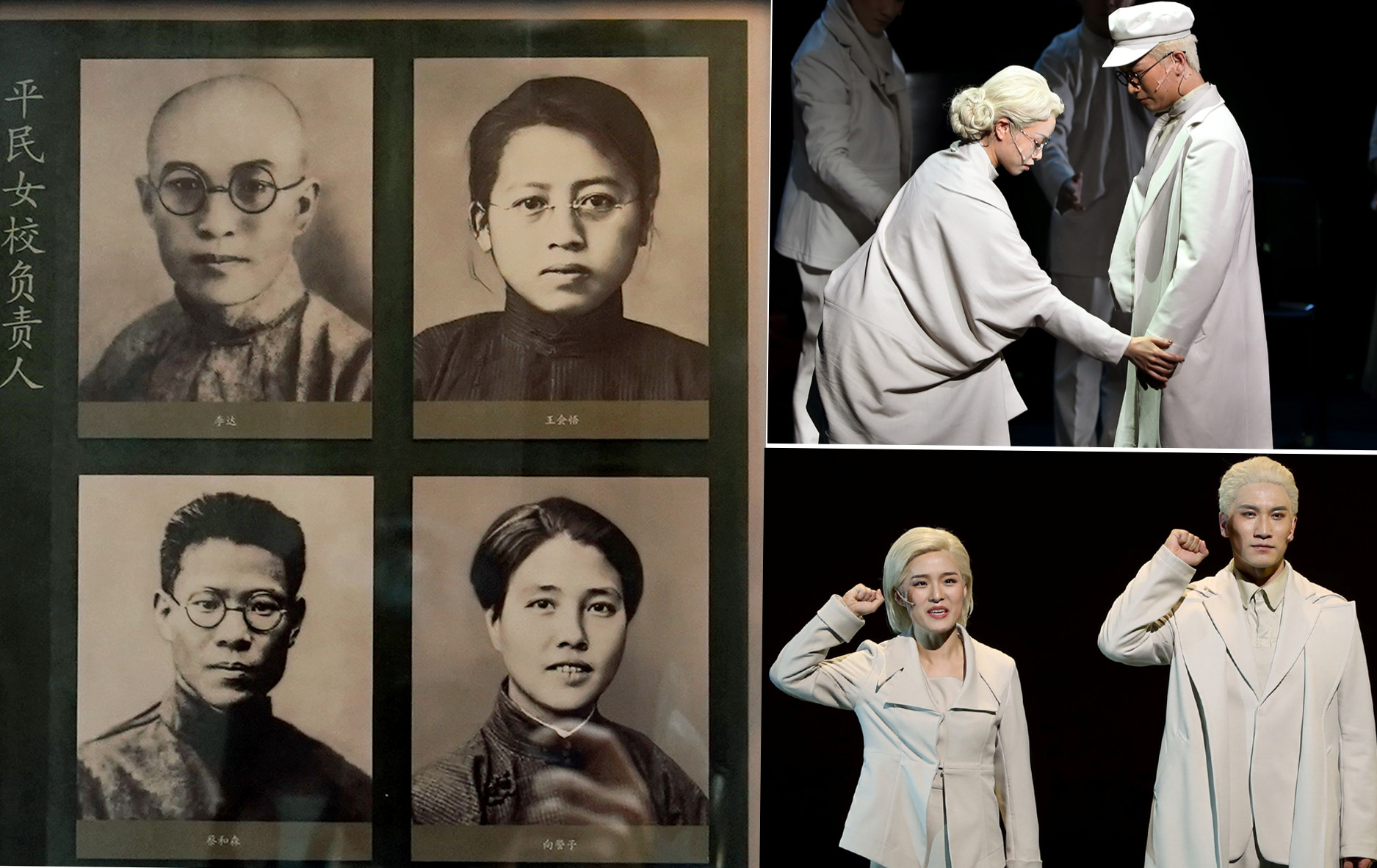 拼版照片:左图为中共二大会址纪念馆里的李达、王会悟夫妇和蔡和森、向警予夫妇的肖像照片;右图为《辅德里》舞台上的李达、王会悟夫妇(上)和蔡和森、向警予夫妇(下)。新华社记者刘颖摄