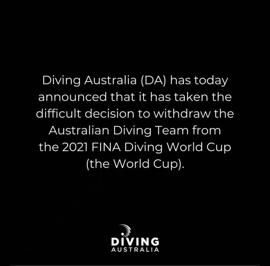 澳跳水协会在新闻公告中称:“我们认为,运动员的健康和安全是头等大事,从最近几周的情况来看形势越来越明朗,那就是让我们的运动员和官员去参加跳水世界杯不安全,日本目前正在经历第四波新冠肺炎疫情的高峰。”