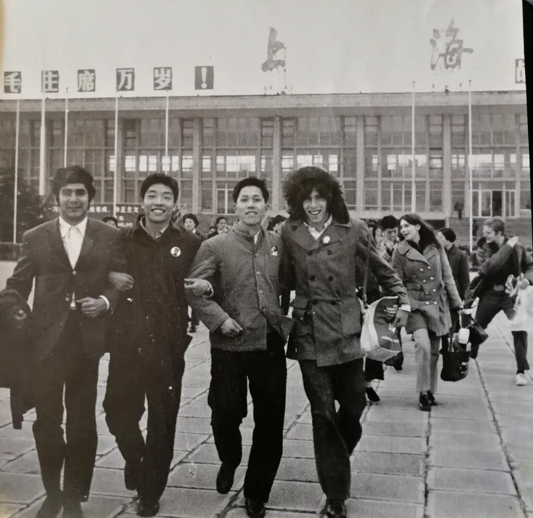 1971年4月15日,美国乒乓球代表团成员格伦·科恩(右一)、埃罗尔·雷塞克(左一)与上海乒乓球队运动员姚振绪(右二)、吴新民(左二)合影。