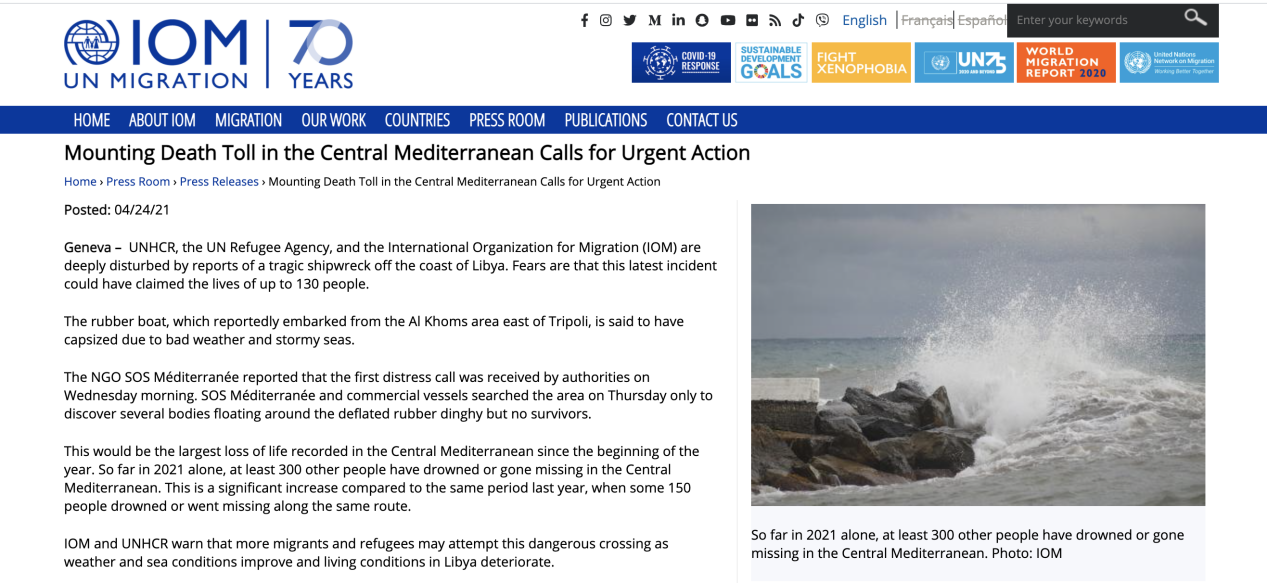 声明指出,这是今年初以来地中海中部记录的最大生命损失。到目前为止,仅2021年至少另有300人在地中海中部溺水或失踪,与去年同期相比增长约三倍。