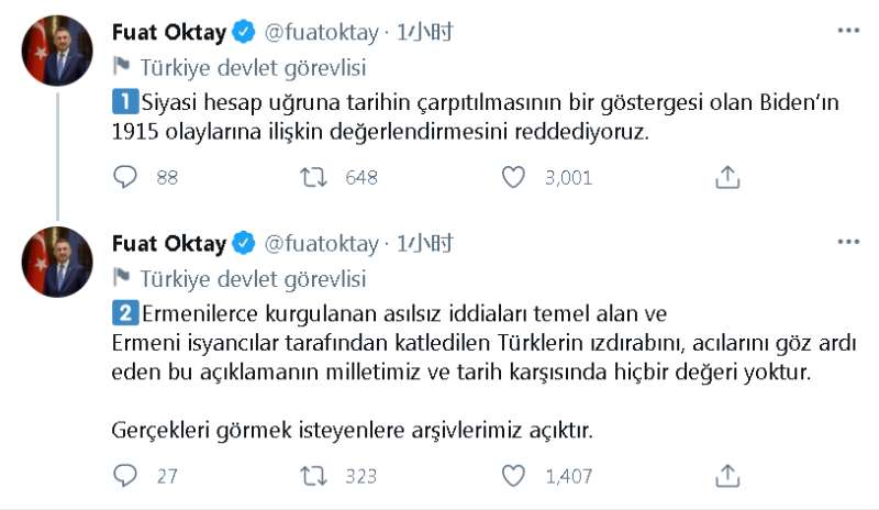 土耳其副总统奥克塔伊表示,“拒绝接受拜登关于1915年事件的表态”,并称这一表态“是对历史的扭曲”,忽视了被亚美尼亚人屠杀的土耳其人所遭受的苦难。
