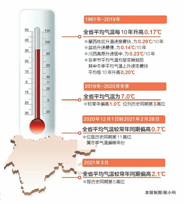 据1961年-2019年间气象观测资料,研究人员发现:近20年是四川有气象记录以来最热的时期。在观测期内,四川全省平均气温每10年升高0.17℃。