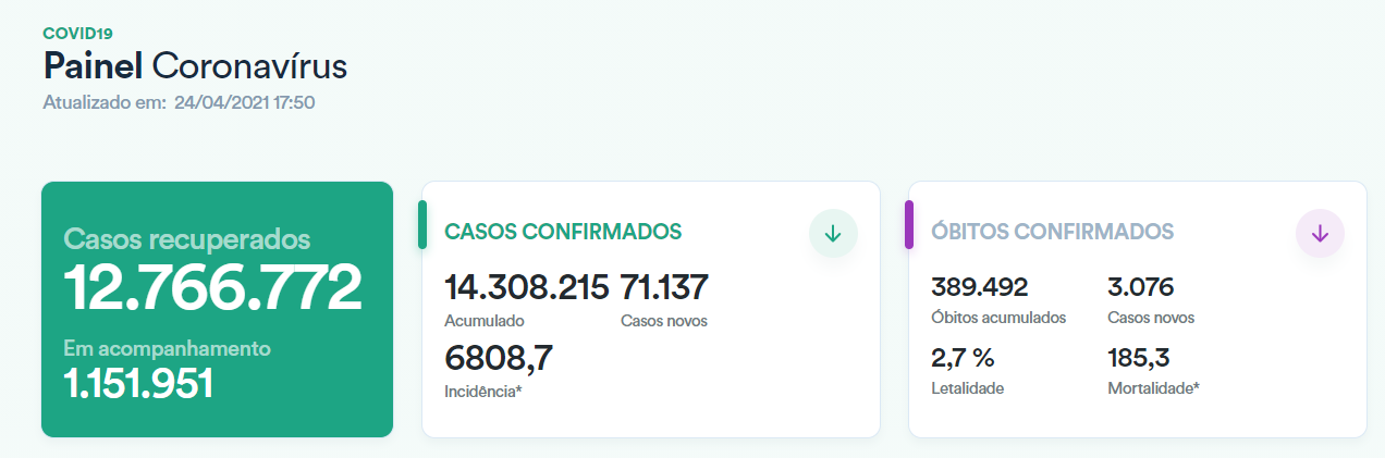 据巴西卫生部官网的数据显示,截至当地时间4月24日,巴西新冠肺炎累计确诊病例14308215例,较前一日新增71137例;累计死亡病例389492例,较前一日新增3076例。