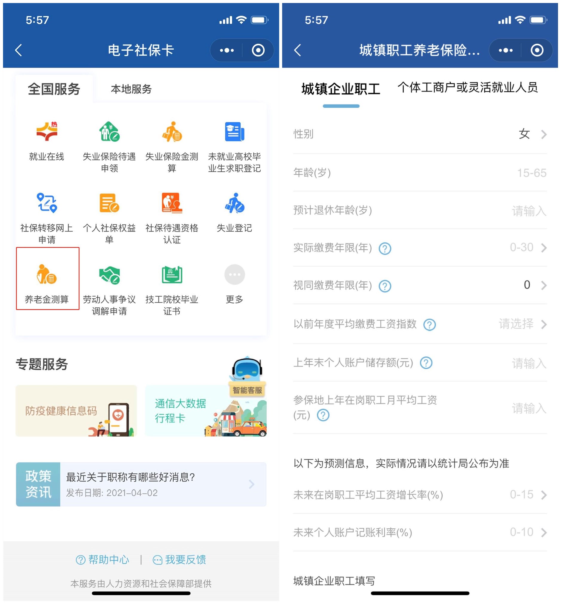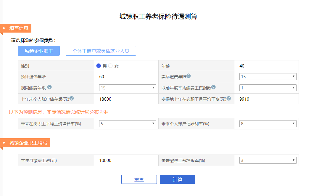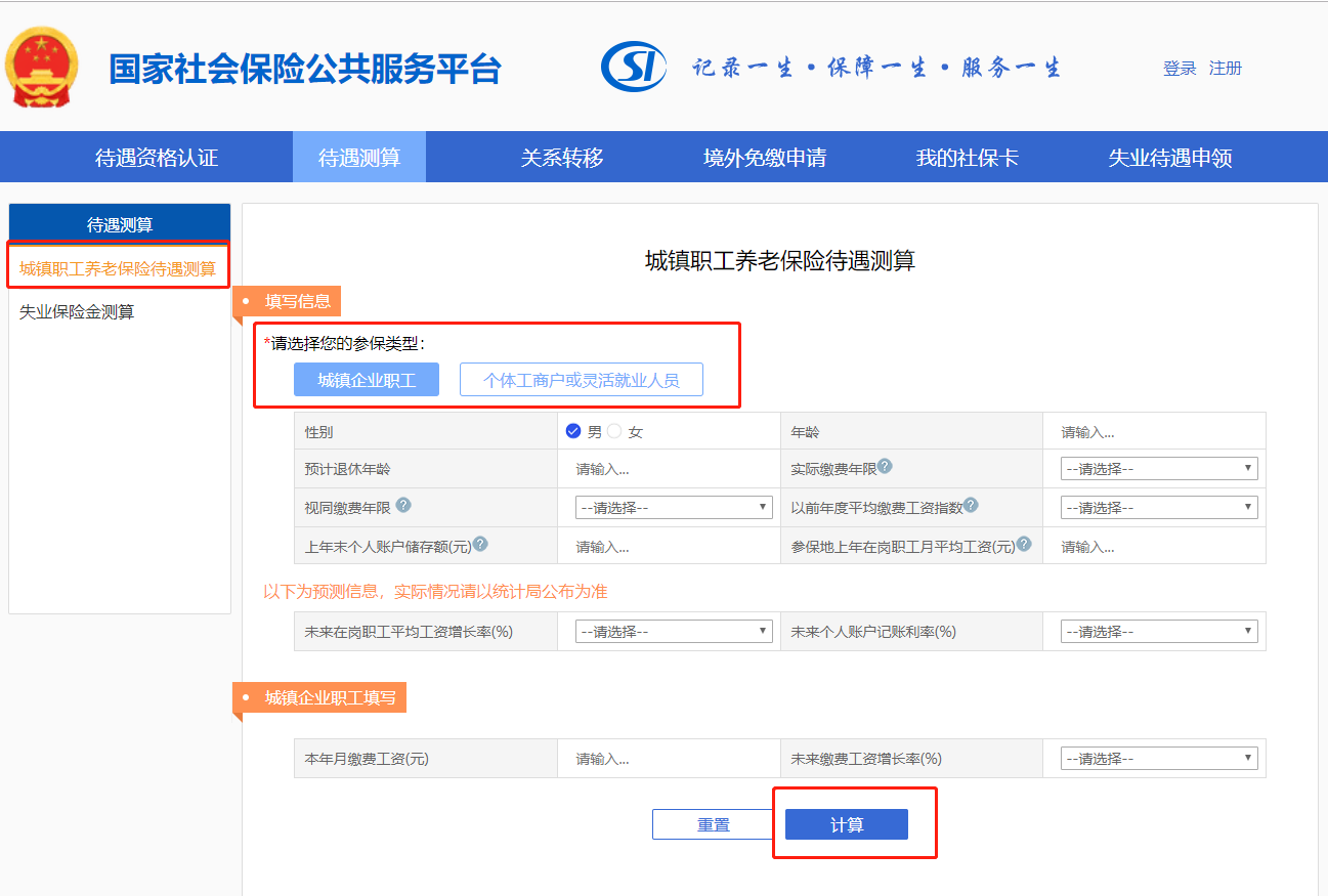 ②选择“城镇职工养老保险待遇测算”后,选择您的参保类型并填写相应的参数,就可以预估自己的养老金啦!