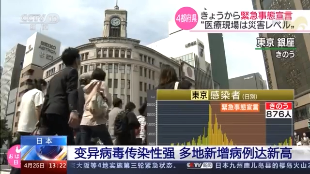 今天(25日)开始,东京、大阪、兵库、京都4个都府县进入第三轮紧急状态。期限暂定为4月25日到5月11日。日本防疫专家指出,2020年4月和今年1月,日本已两次宣布进入紧急状态。本轮紧急状态持续17天,疫情能否得到有效遏制有待观察。