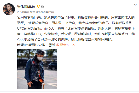 今天(25日)的UFC261期比赛中,张伟丽对战美国选手罗斯。第一回合中,张伟丽被罗斯高扫直接踢倒在地,卫冕失败。赛后,张伟丽表示:“我还可以再回来,我觉得我们很快还会再在这里相聚。
