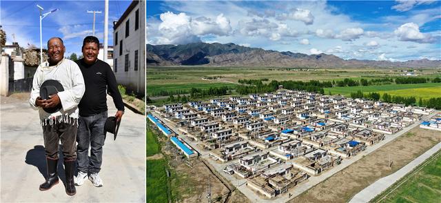 拼版照片:左图为西藏日喀则市萨迦县扯休乡吉雄村村民多吉(左)和儿子顿珠;右图为扯休乡吉雄村一角(无人机照片)。新华社记者 詹彦 摄