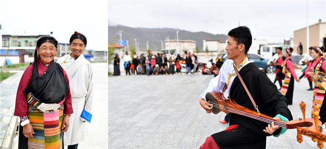 拼版照片:左图为西藏日喀则市拉孜县查务乡明玛村村民仓琼(左)和儿子群培次仁;右图为拉孜县民间艺术团在明玛村易地搬迁点为村民表演。新华社记者 詹彦 摄