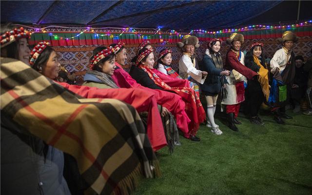西藏日喀则市扎西宗乡巴松村发展旅游产业,当地农牧民和游客一起跳起民族舞蹈。新华社记者 孙非 摄