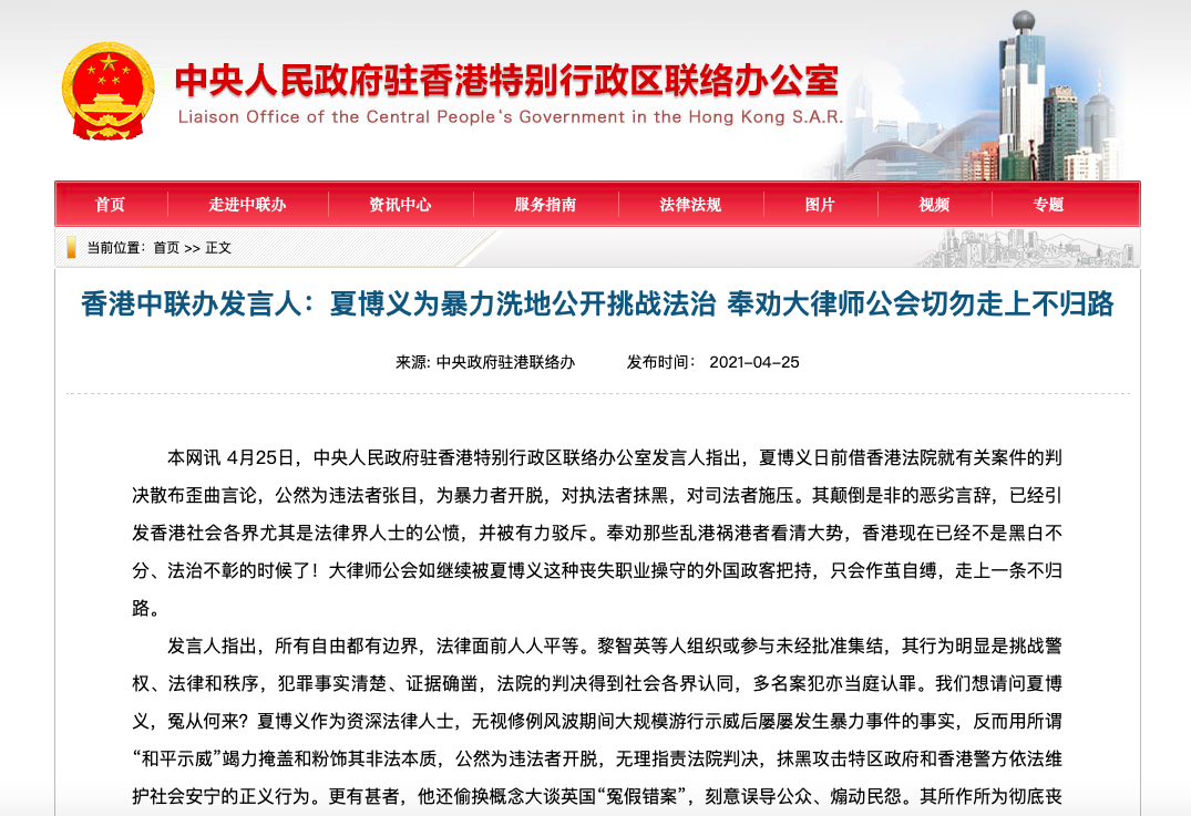 4月25日,中央人民政府驻香港特别行政区联络办公室发言人指出,夏博义日前借香港法院就有关案件的判决散布歪曲言论,公然为违法者张目,为暴力者开脱,对执法者抹黑,对司法者施压。其颠倒是非的恶劣言辞,已经引发香港社会各界尤其是法律界人士的公愤,并被有力驳斥。奉劝那些乱港祸港者看清大势,香港现在已经不是黑白不分、法治不彰的时候了!大律师公会如继续被夏博义这种丧失职业操守的外国政客把持,只会作茧自缚,走上一条不归路。