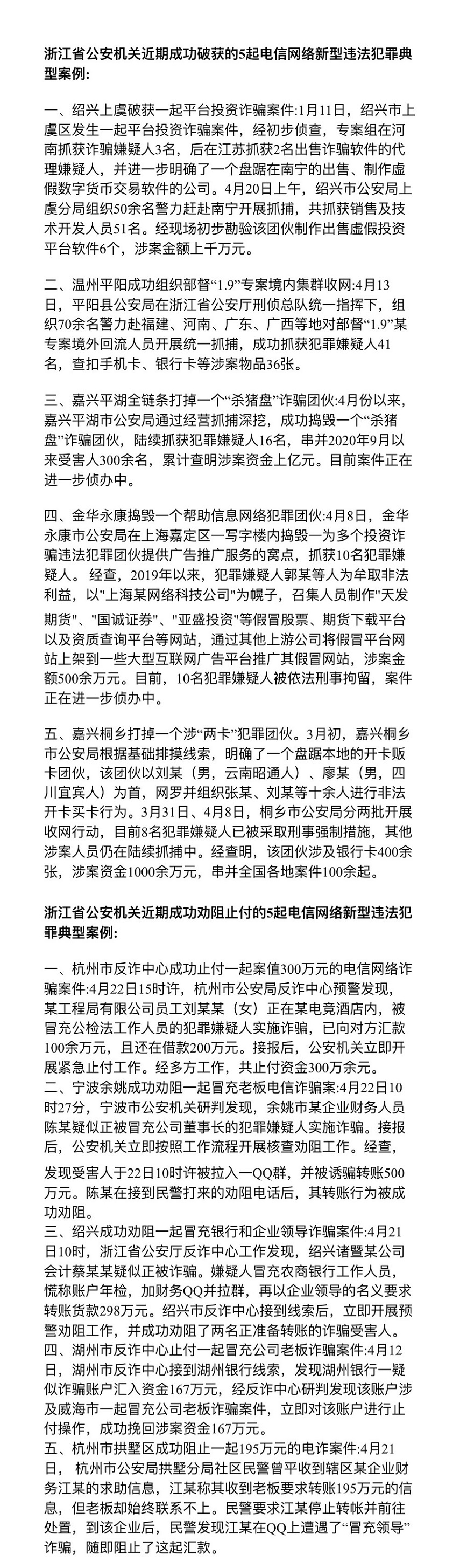 会议还通报了近期浙江省公安机关成功破获、有效止损的10起电信网络新型违法犯罪典型案例。