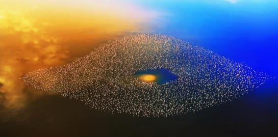 在肯尼亚纳特龙湖,夕阳余晖中,成千上万的火烈鸟在湖中聚集,形成了眼睛的形状。