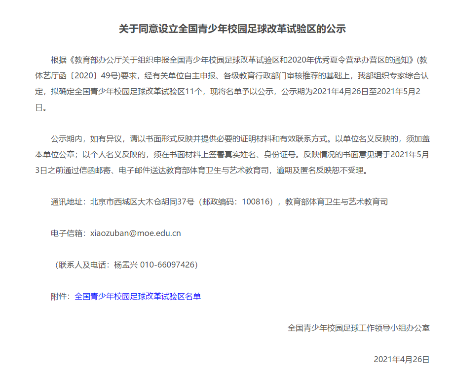 据教育部官网4月26日消息,全国青少年校园足球工作领导小组办公室发布《关于同意设立全国青少年校园足球改革试验区的公示》称,拟确定全国青少年校园足球改革试验区11个,公示期为2021年4月26日至2021年5月2日。