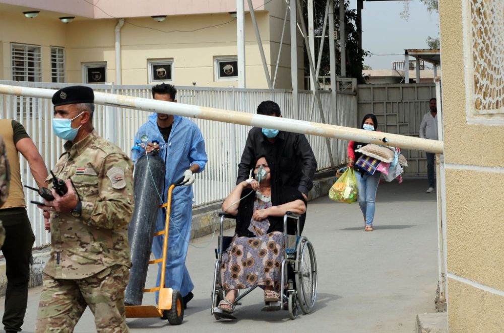 4月25日,人们在伊拉克巴格达发生火灾的新冠定点医院转移患者。(新华社发,哈利勒·达伍德摄)