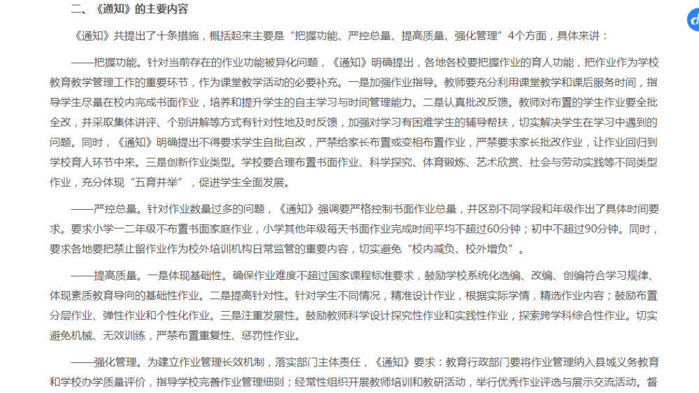 同日,教育部发文,要求各地要把禁止留作业作为校外培训机构日常监管的重要内容,坚决防止校外培训机构给中小学生留作业,切实避免“校内减负、校外增负”。