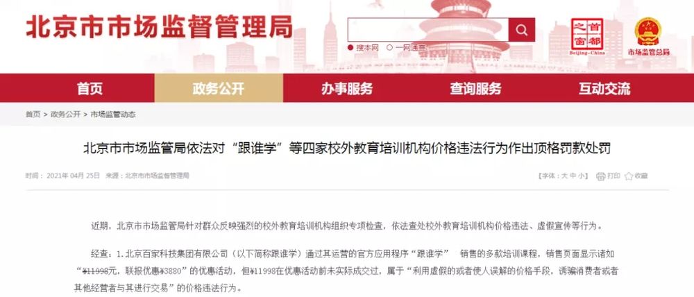 新华社北京4月26日电(中国证券报记者董添)4月25日,北京市市场监督管理局通报,对跟谁学、学而思、新东方在线、高思四家校外教育培训机构的违法违规行为给予警告和50万元顶格罚款的行政处罚。
