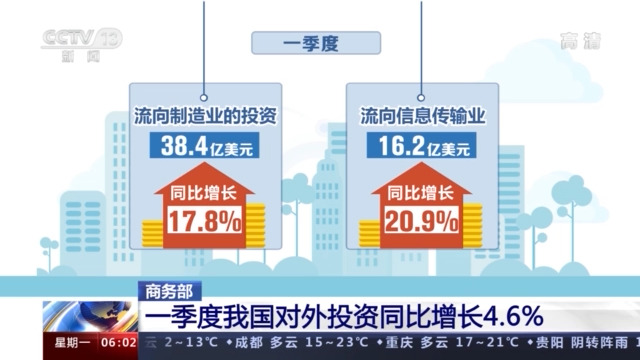 商务部昨天(25日)公布的数据显示,一季度,我国对外直接投资2061.4亿元人民币,同比增长4.6%。