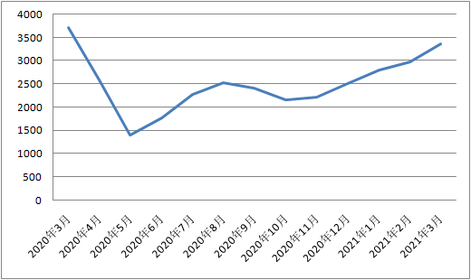图:2020年3月-2021年3月中国进口保税航空煤油到岸价格走势