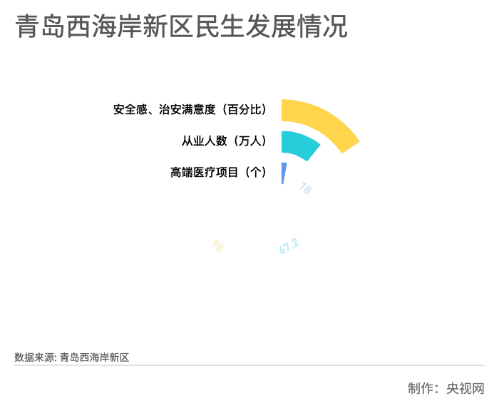 目前,新区新建、改扩建中小学、幼儿园215所,超过前20年总和;引进高端医疗项目18个,聚焦智慧医疗,建成以远程医疗为载体的检验、影像、远程会诊、病理、消毒供应五大“共享中心”;全社会从业人数67.2万人,城镇登记失业率仅3%左右。通过深化社会治理创新,青岛西海岸新区连续三年被评为全国创新社会治理优秀城市,群众安全感和治安满意度超过98%。