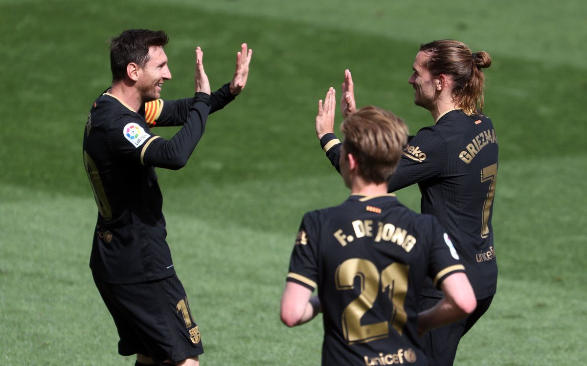 巴塞罗那队球员梅西(左)和格列兹曼(右)在比赛中庆祝进球。