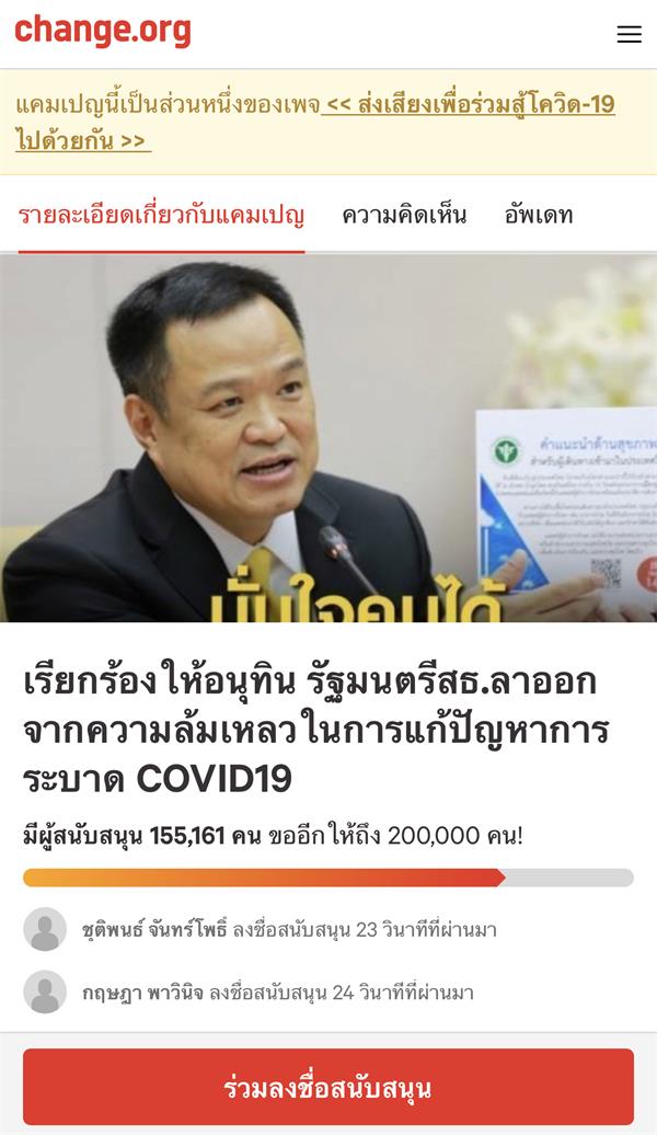 当地时间4月25日,泰国医护工作者在网站上发起签名活动要求泰国副总理兼卫生部长阿努廷辞职。理由是自泰国新冠疫情暴发、尤其是今年3月底第三轮疫情暴发以来,阿努廷未采取足够应对措施,导致确诊病例激增,阿努廷应为此负领导责任。