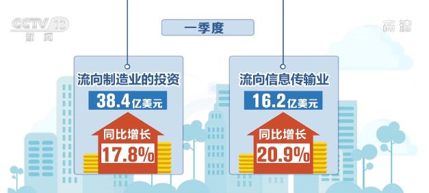 从投资流向看,制造、信息传输等领域的投资增长较快。一季度,流向制造业的投资38.4亿美元,同比增长17.8%;流向信息传输业16.2亿美元,同比增长20.9%。
