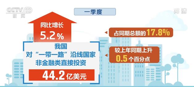 数据显示,一季度,我国对“一带一路”沿线国家非金融类直接投资44.2亿美元,同比增长5.2%,占同期总额的17.8%,较上年同期上升0.5个百分点。在沿线国家新签承包工程合同额313.4亿美元,完成营业额177.5亿美元,分别同比增长19.4%和12.4%。
