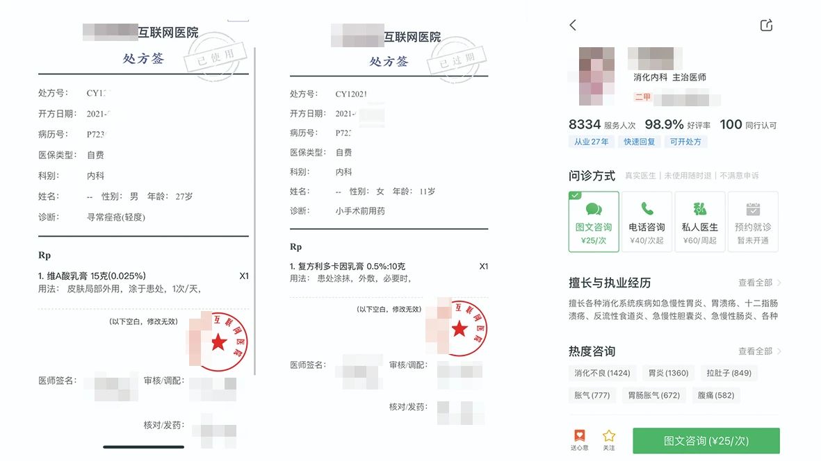 几分钟后,平台为半月谈记者匹配了一名皮肤性病科医生曹医生。半月谈记者询问“能否帮忙开个维A酸乳膏”,曹医生迅速开具了电子处方,并叮嘱“此药避免大面积涂,刺激皮肤”。又过了几分钟,电子处方通过了药师黄某某的审核。半月谈记者即凭着这套“逆”操作,获得了处方,付费购买了处方药。