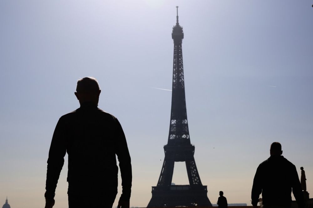 3月31日,人们走在法国巴黎埃菲尔铁塔附近的特罗卡德罗广场。(新华社记者高静摄)