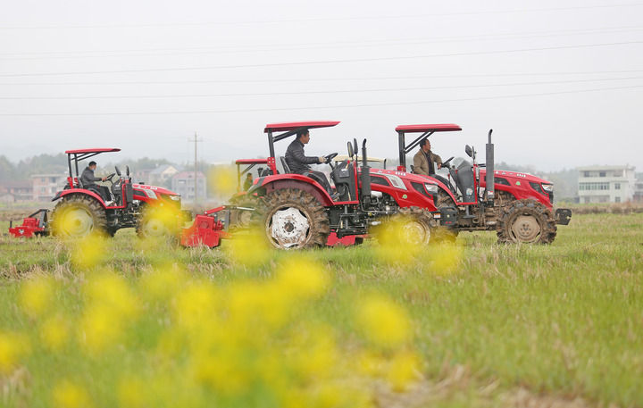 3月3日,在江西省兴国县高兴镇新圩村高标准农田里,农户驾驶“铁牛”翻耕农田 。 新华社发(张声 摄)