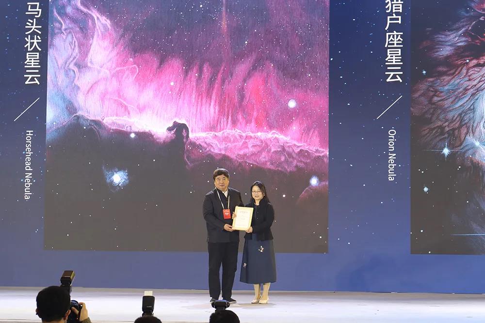 4月24日是中国航天日,以“扬帆起航 逐梦九天”为主题的第6届“中国航天日”主场活动在江苏南京拉开帷幕。当天,陈英华带着她的“宇宙星空系列”刺绣作品登上活动开幕式领奖台,捧回国家航天局首届“太空探索与艺术创想大赛”特别奖。故宫博物院原院长单霁翔为她颁奖。