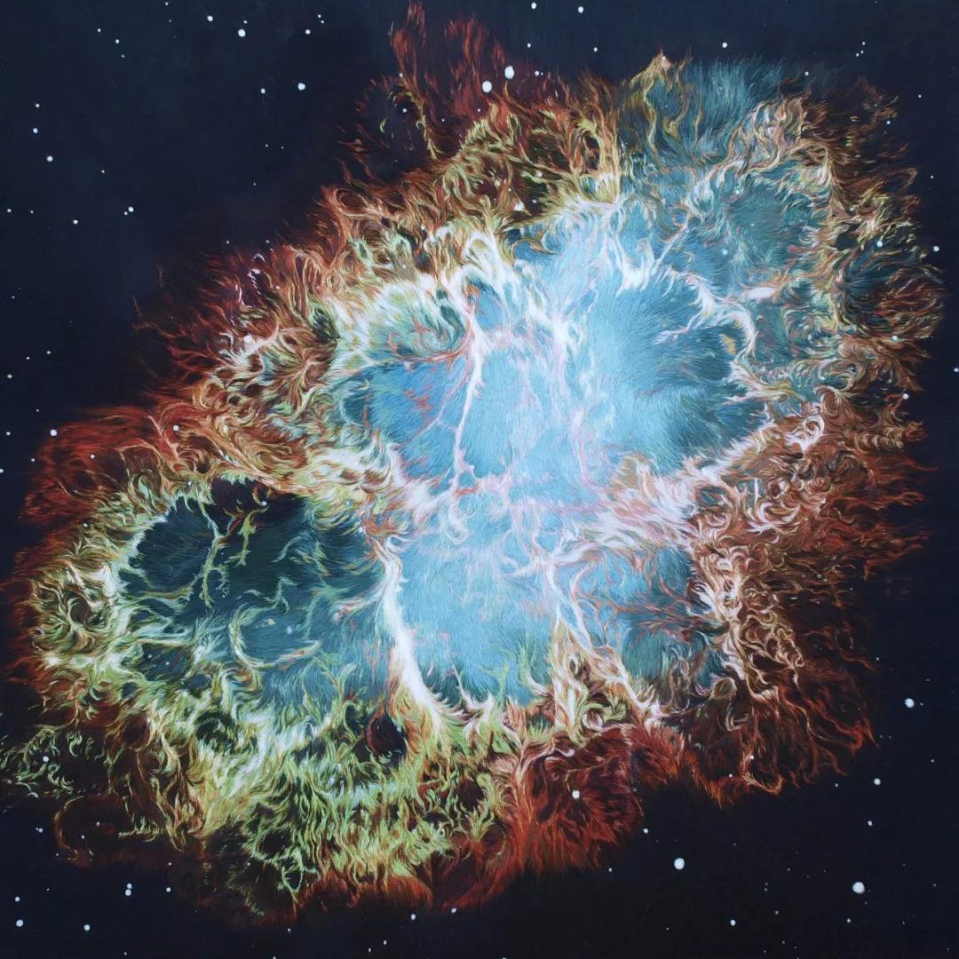 历时两年多,陈英华用10多种针法,创作出星空系列的《蟹状星云》《狮子座流星雨》等16幅“星空系列”作品。上万种颜色和针线互相交织,呈现出高级的光泽感,不禁让人觉得这是高逼真、高像素级别的摄影作品。