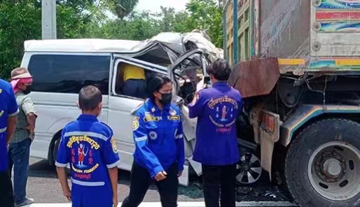 当地时间26日,泰国西部靠近缅甸边境的北碧府发生一起面包车追尾停靠在公路边大货车的重大交通事故,造成面包车上3名泰国军人当场死亡。追尾面包车前半部分已经面目全非,救援人员赶到现场,使用千斤顶、切割设备将3具军人遗体从车辆残骸中分离出来。(总台记者 陈林聪)