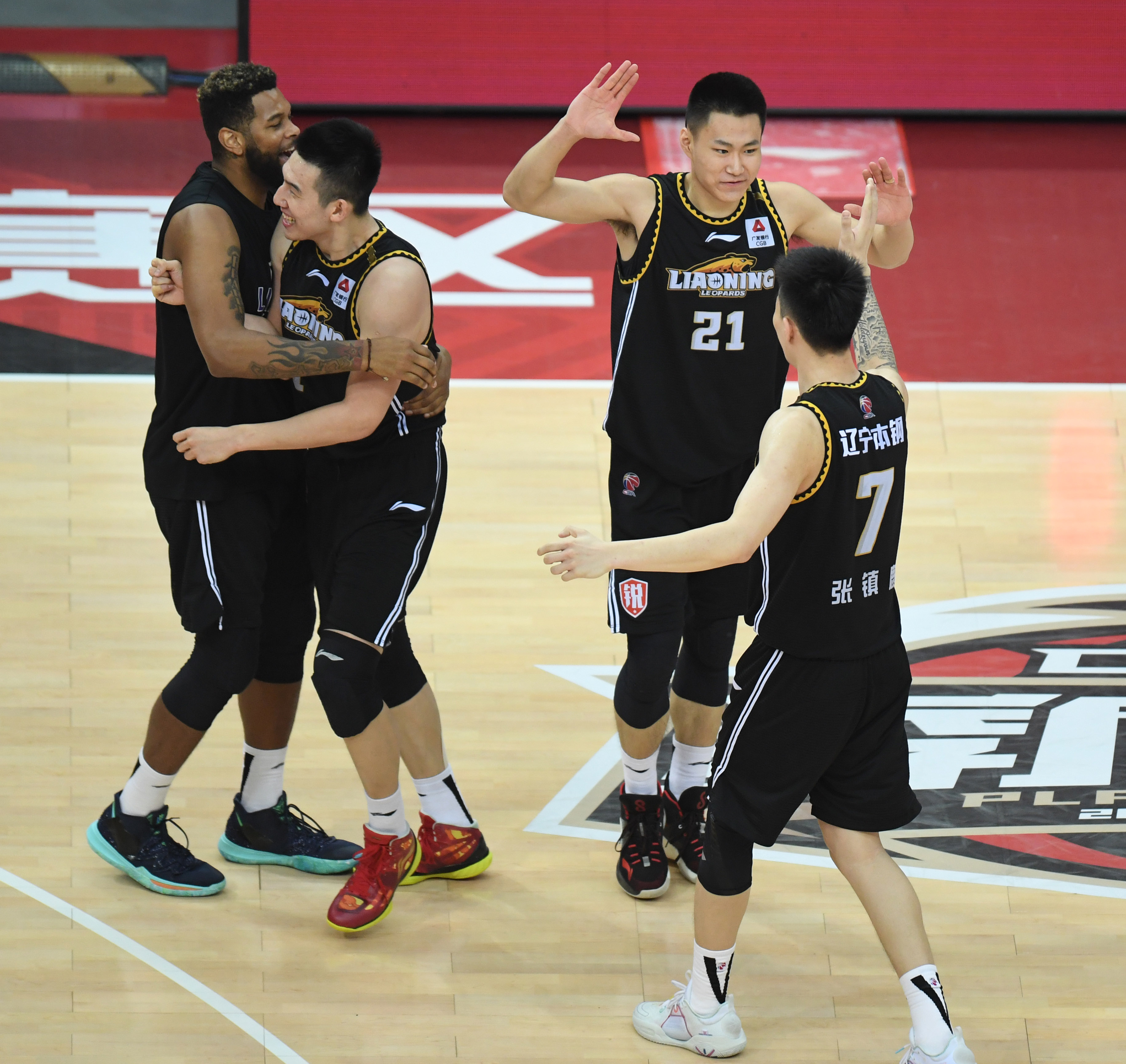 4月23日,辽宁队球员泰勒、付豪、吴昌泽、张镇麟(从左至右)获胜后庆祝。新华社记者 沙达提 摄
