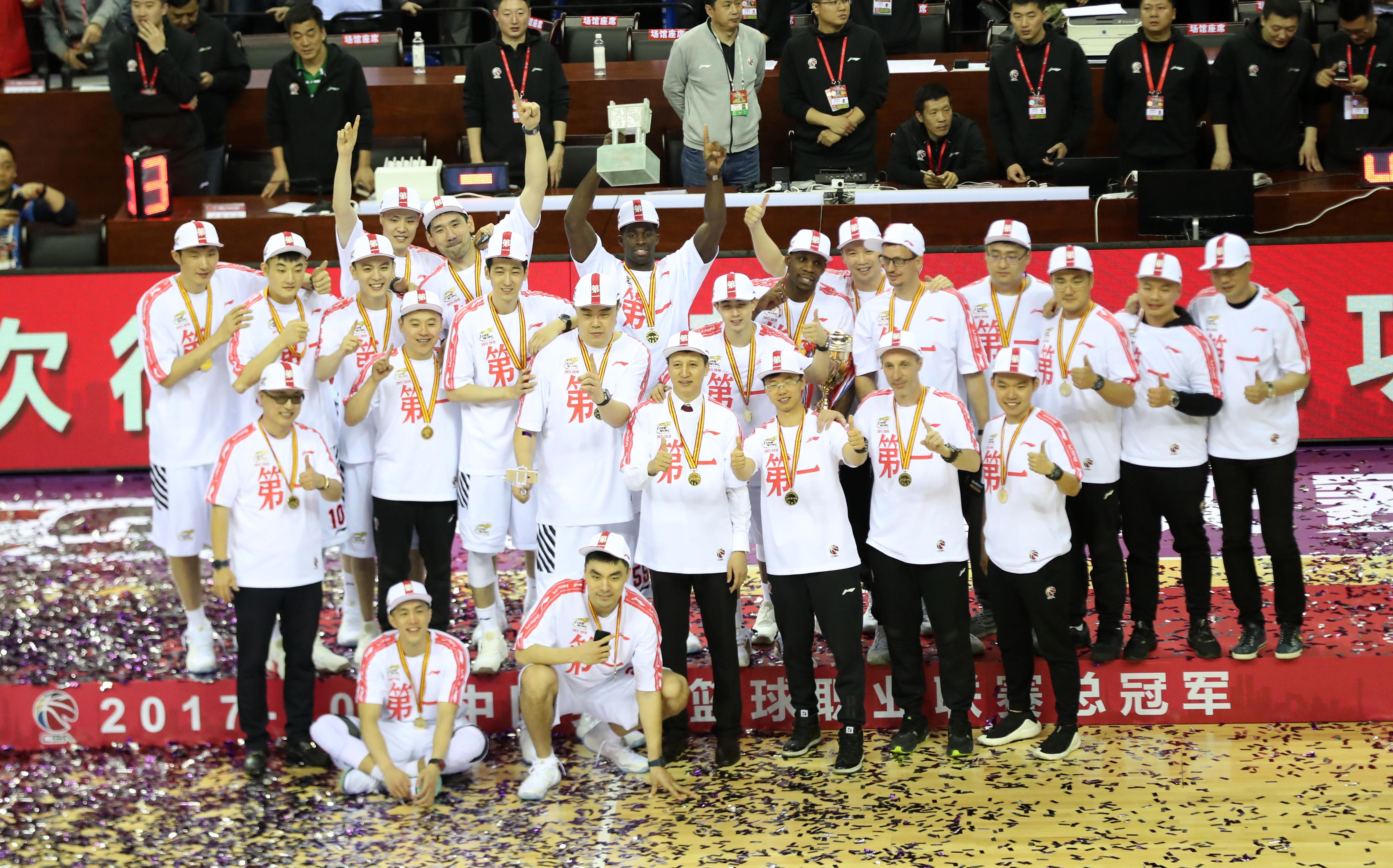 图为2018年4月22日,辽宁队球员在颁奖仪式上庆祝。当日,在2017-2018赛季中国男子篮球职业联赛(CBA)总决赛第四场比赛中,辽宁本钢队主场以100比88战胜浙江广厦控股队,从而以4比0的总比分夺冠。新华社记者李钢摄