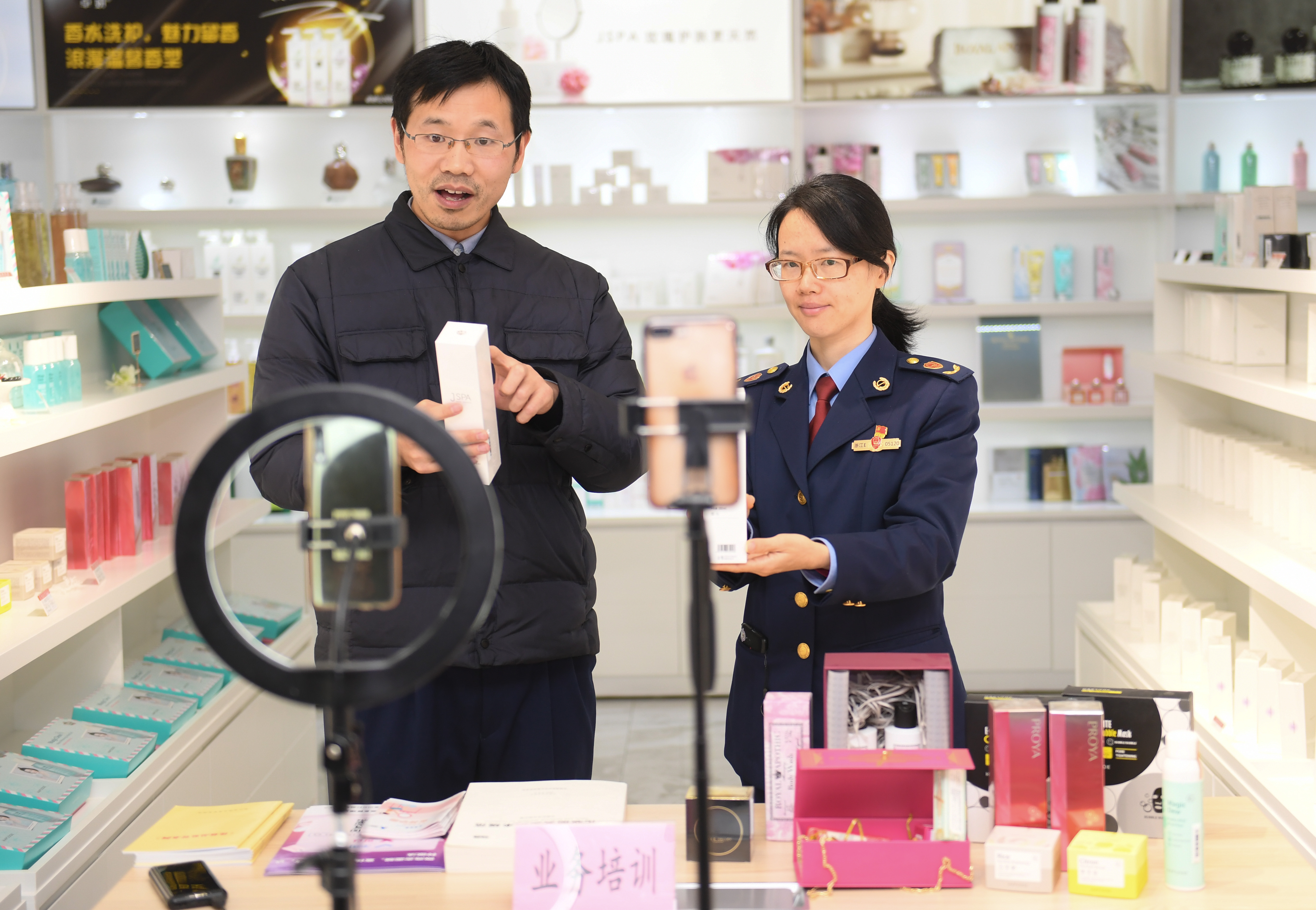 在浙江湖州吴兴区埭溪镇,化妆品行业监管所工作人员通过网络直播开展专项宣传培训(新华社记者翁忻旸摄)
