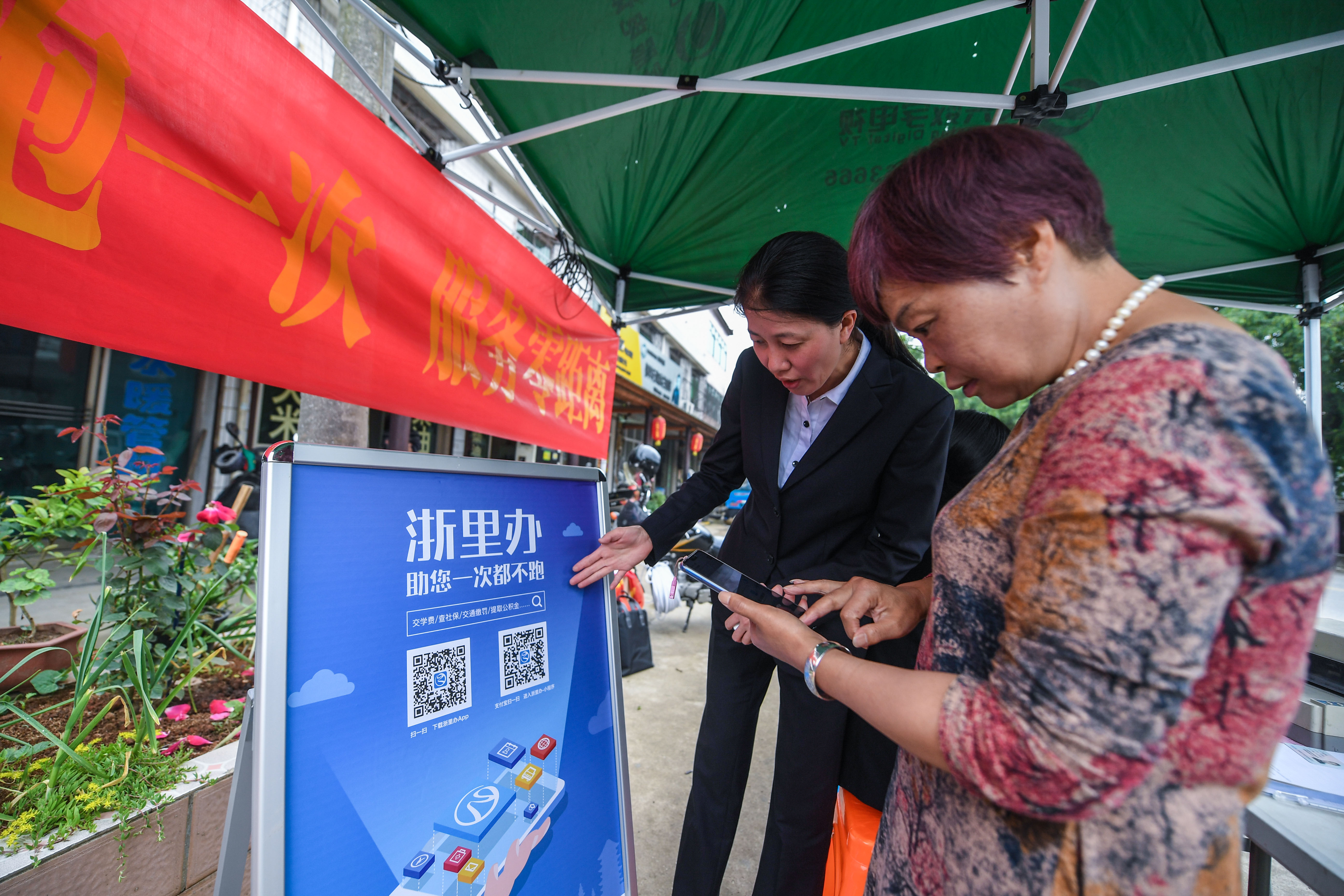 浙江省长兴县林城镇便民服务中心工作人员在太傅村给村民推广便民“浙里办”APP(新华社记者徐昱摄)